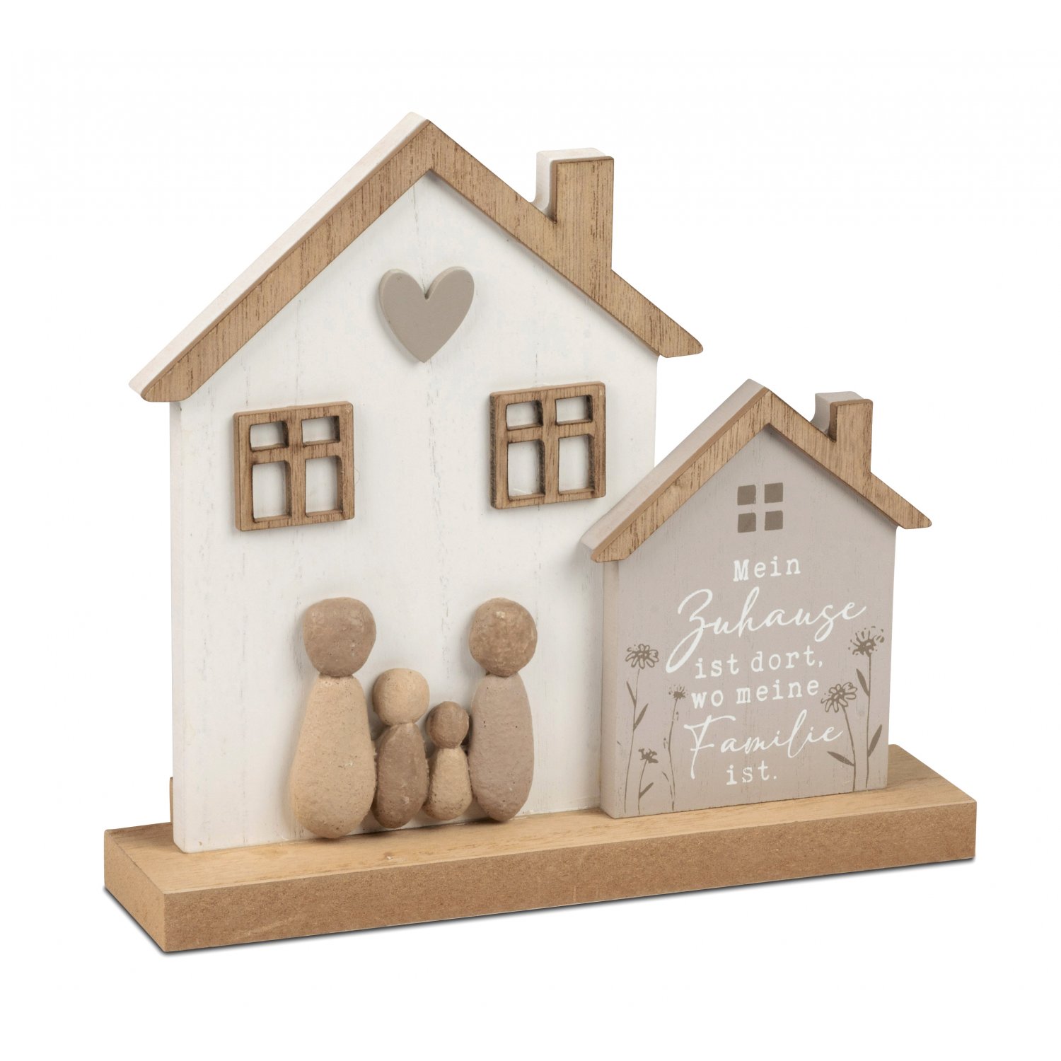 Haus aus Holz mit Steinfiguren (Steinoptik)