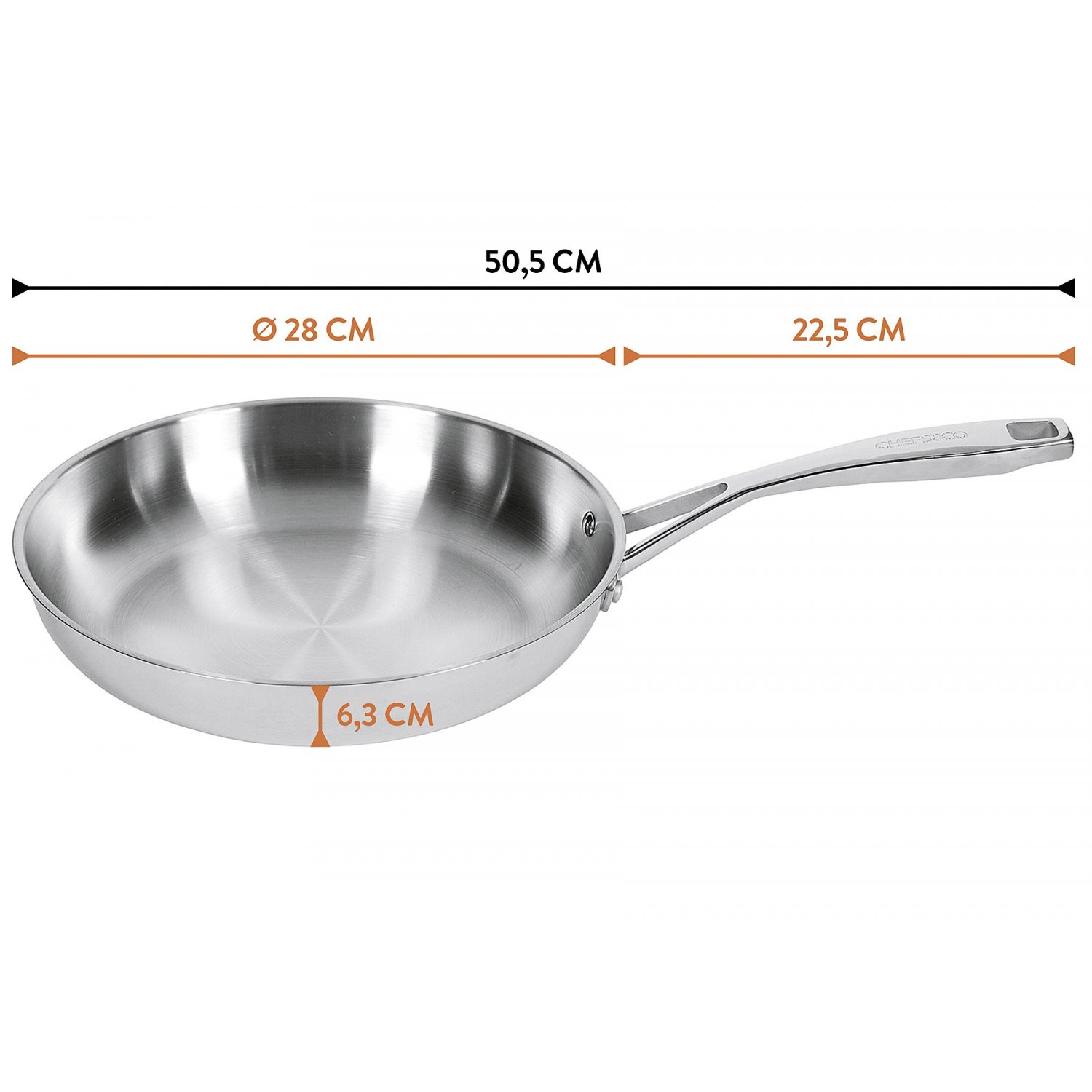Du suchst nach einer hochwertigen Bratpfanne für deine Küche? Unsere Pfanne 28 cm aus der hochwertigen Edelstahl Pfannenserie Profi Gourmet ist die perfekte Wahl für dich! Mit unserer unbeschichteten Bratpfanne von CHEFS&CO aus Edelstahl bringst du Fleischstücke ordentlich ins Schwitzen: Sie eignet sich besonders gut zum scharfen Anbraten von Fleisch. Hol dir jetzt unsere Bratpfanne aus der Profi Gourmet Serie und entdecke die Vielseitigkeit: Dank ihrer Backofentauglichkeit bis 230°C kannst du das Fleisch auch ideal im Ofen niedergaren. Zudem ist sie für alle Herdarten geeignet, einschließlich Induktion!