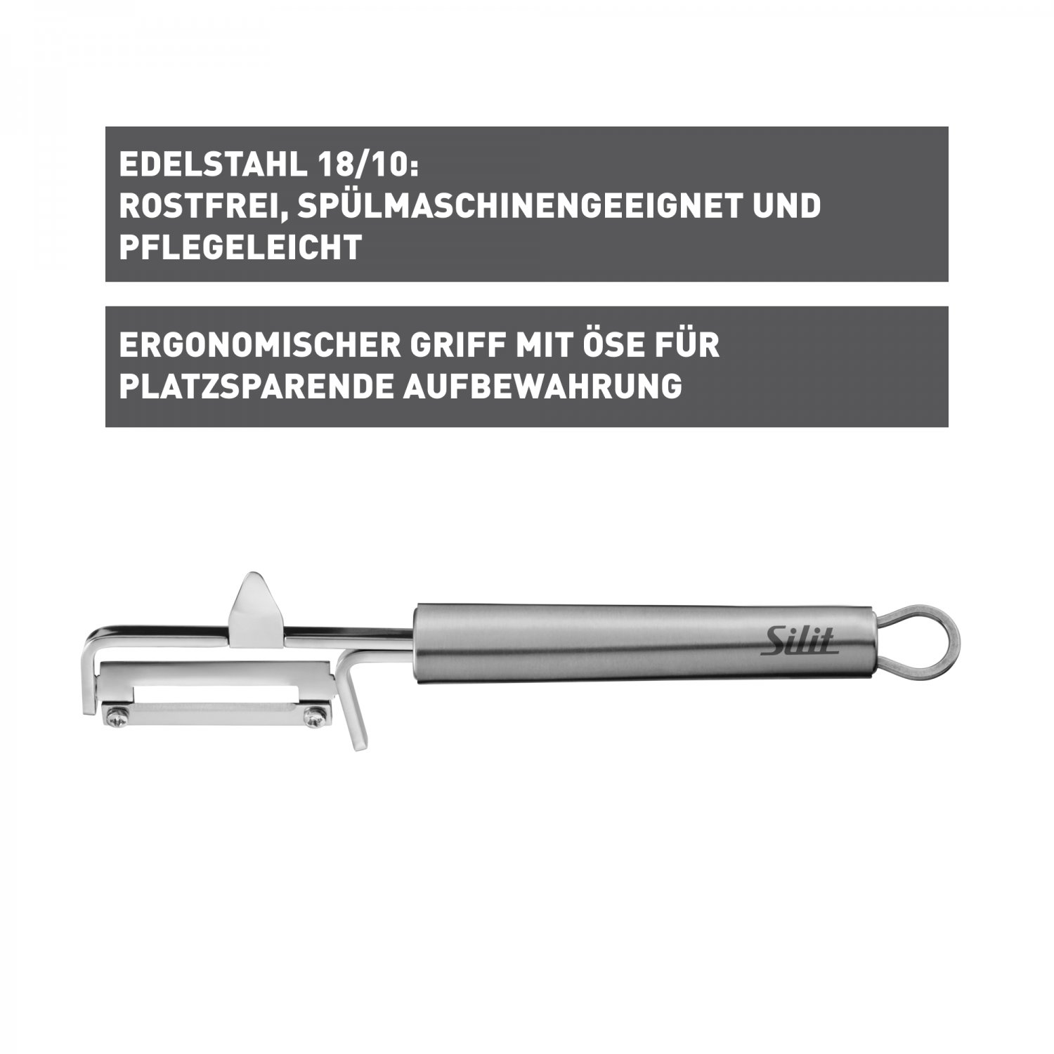 Der 19 cm lange Silit Classic Line Gemüsschäler aus hochwertigem Edelstahl eignet sich zum Schälen einer Vielzahl an Zutaten: Karotten, Gurken, Kartoffeln, Äpfel, Rote Bete, Spargel und vieles mehr trennt er mühelos und hauchdünn von ihrer Schale, so dass die direkt unter der Schale sitzenden Nährstoffe und Vitamine nicht verloren gehen. Auch über Unebenheiten gleitet die bewegliche Klinge problemlos hinweg, während der integrierte Kartoffelaugen-Entferner unerwünschte Stellen sorgfältig entfernen hilft. Silit Classic Line Küchenhelfer vereinen elegantes und zeitloses Design mit höchster Funktionalität. Mit besonders ergonomischen Griffen aus robustem, strapazierfähigem und zugleich edlem Edelstahl sowie einer integrierten Öse zur platzsparenden und stets griffbereiten Aufbewahrung an einer Hängeleiste, überzeugen die praktischen Helfer in jeder Küche. Und selbstverständlich sind sie dazu alltagstauglich und unkompliziert zur Reinigung in der Spülmaschine geeignet.